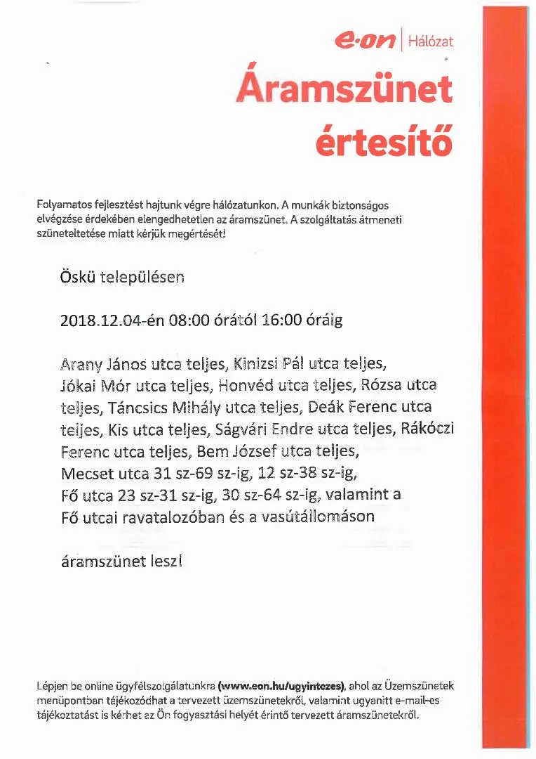 Folyamatos fejlesztést hajtunk végre hálózatunkon. A munkák biztonságos elvégzése érdekében elengedhetetlen az áramszünet. A szolgáltatás átmeneti szüneteltetése miatt kérjük megértését!