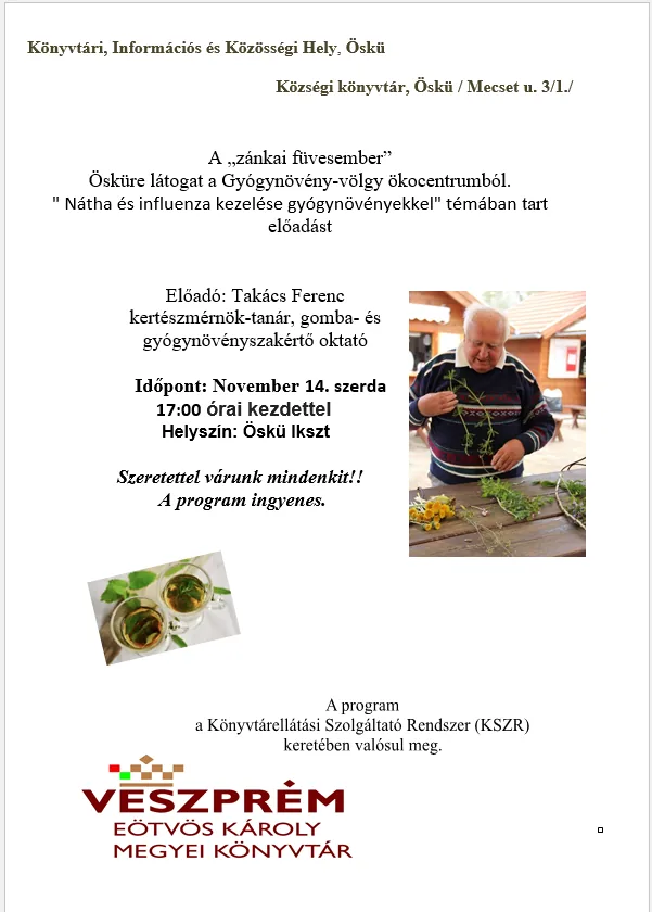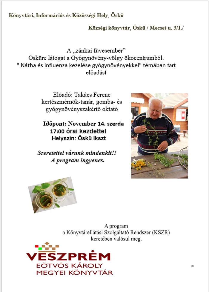 "Nátha és influenza kezelése gyógynövényekkel" témában tart előadást.