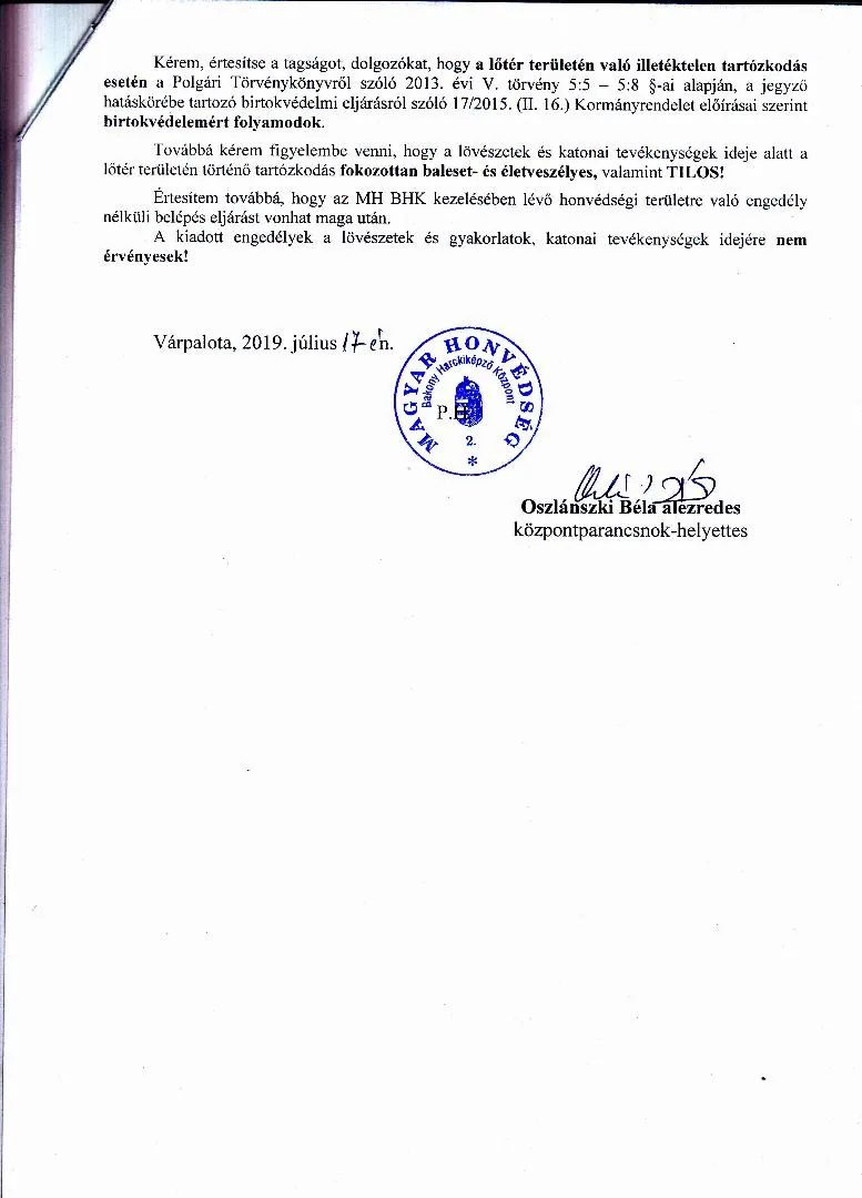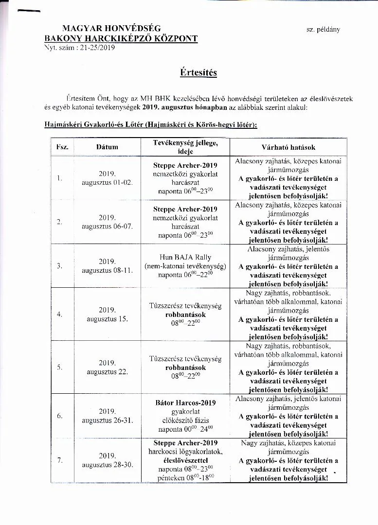 Lőtérértesítő Közszolgálati hír a MH Böszörményi Géza Csapatgyakorlótér Parancsnokság kezelésében lévő honvédségi területeken.