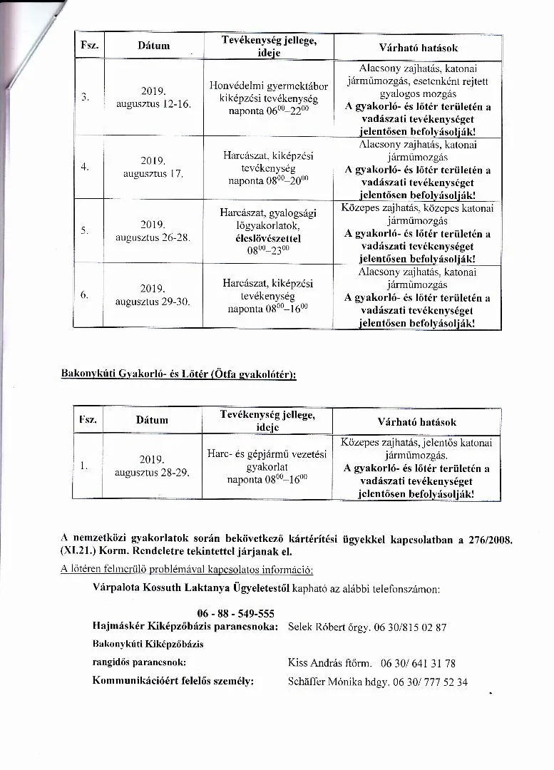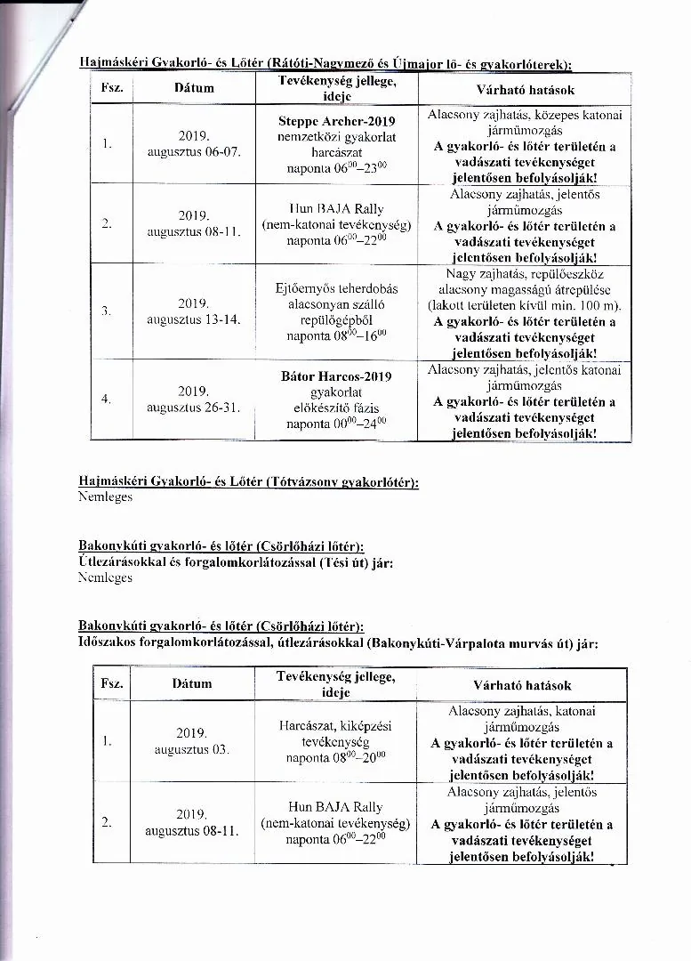 BAKONY HARCKIKÉPZŐ KÖZPONT honvédségi területein az éleslövészetek és egyéb katonai tevékenységek alakulása.