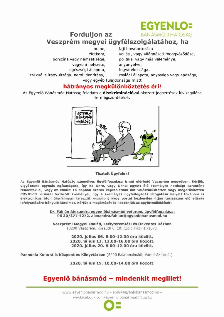 Az Egyenlő Bánásmód Hatóság személyes ügyfélfogadása ismét elérhető Veszprém megyében! Kérjük, vigyázzunk egymás egészségére, így ha Önre, vagy Önnel együtt élő személyre hatósági karantént rendeltek el, vagy az elmúlt 14 napban szoros kapcsolatban állt valószínűsítetten vagy megerősítetten COVID-19 vírussal fertőzött személlyel, úgy a személyes ügyfélfogadás látogatása helyett továbbra is elektronikus úton (ügyfélkapun keresztül, e-papíron) vagy postai kézbesítés útján terjesszen elő eljárás lefolytatására irányuló kérelmet. Kérjük a megértését és köszönjük az együttműködését!
