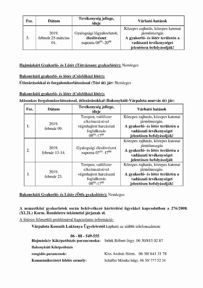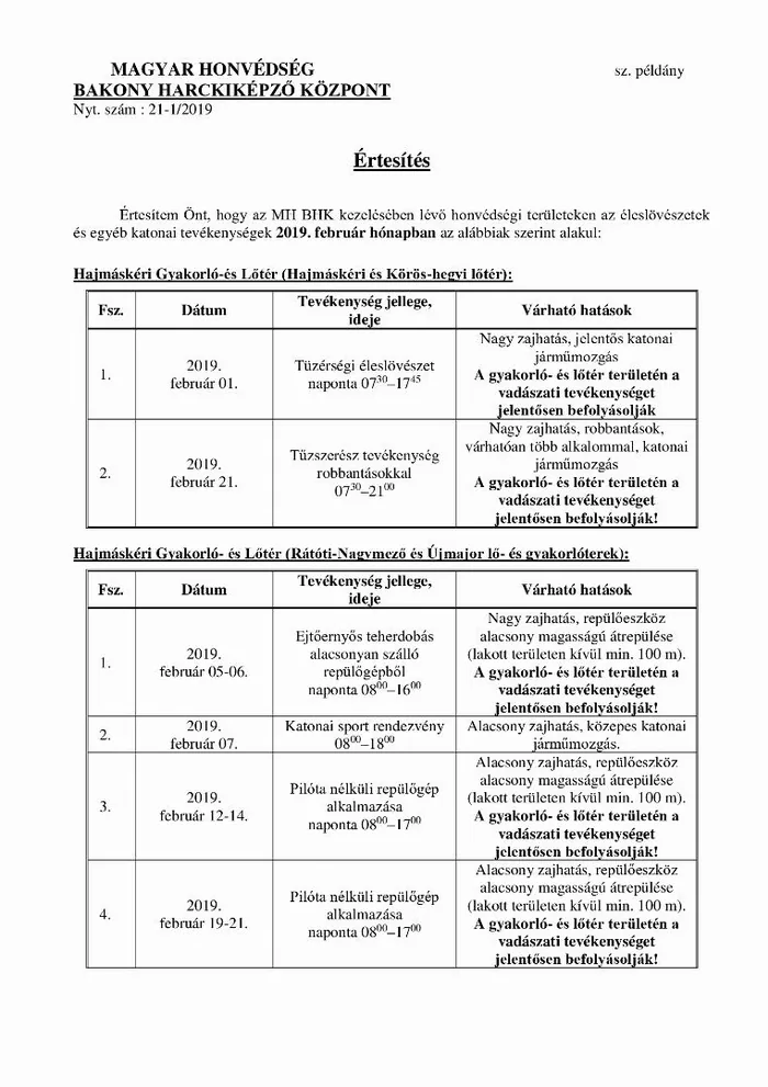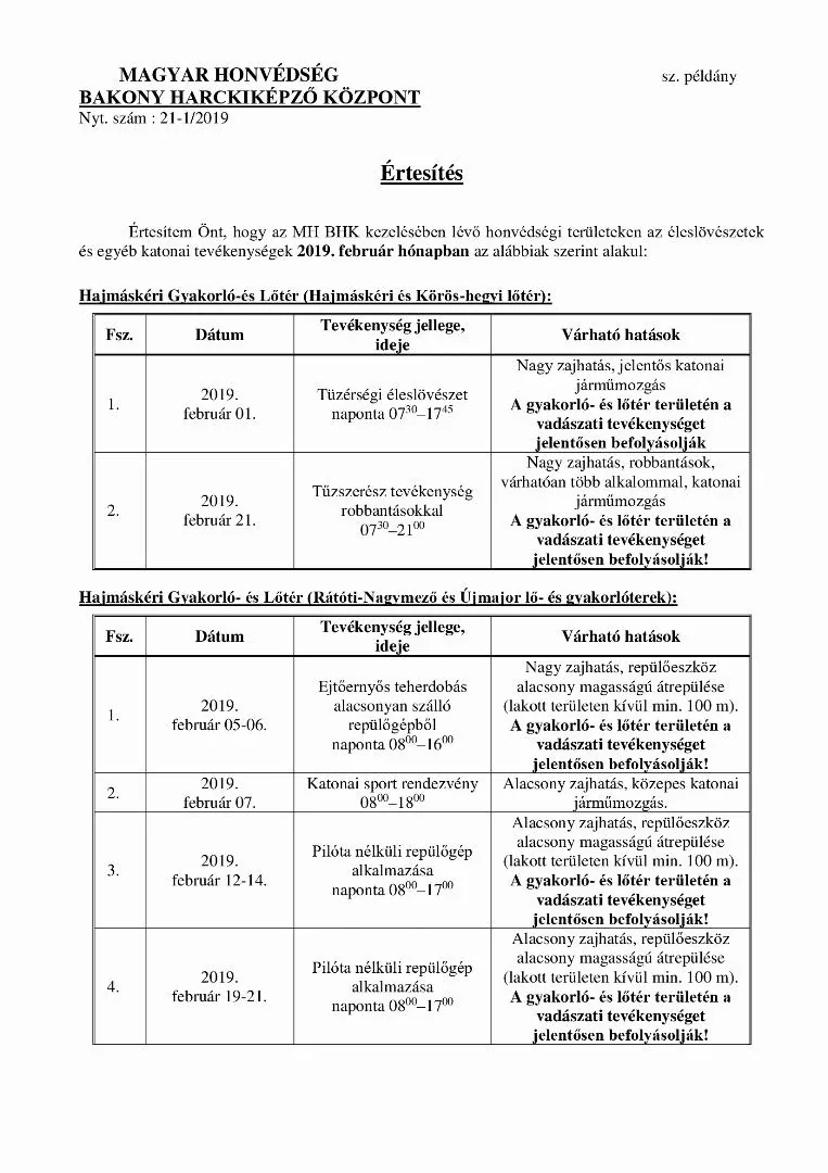 Bakony Harckiképző központ Tájékoztatója éleslövészetről, februári hónapban...