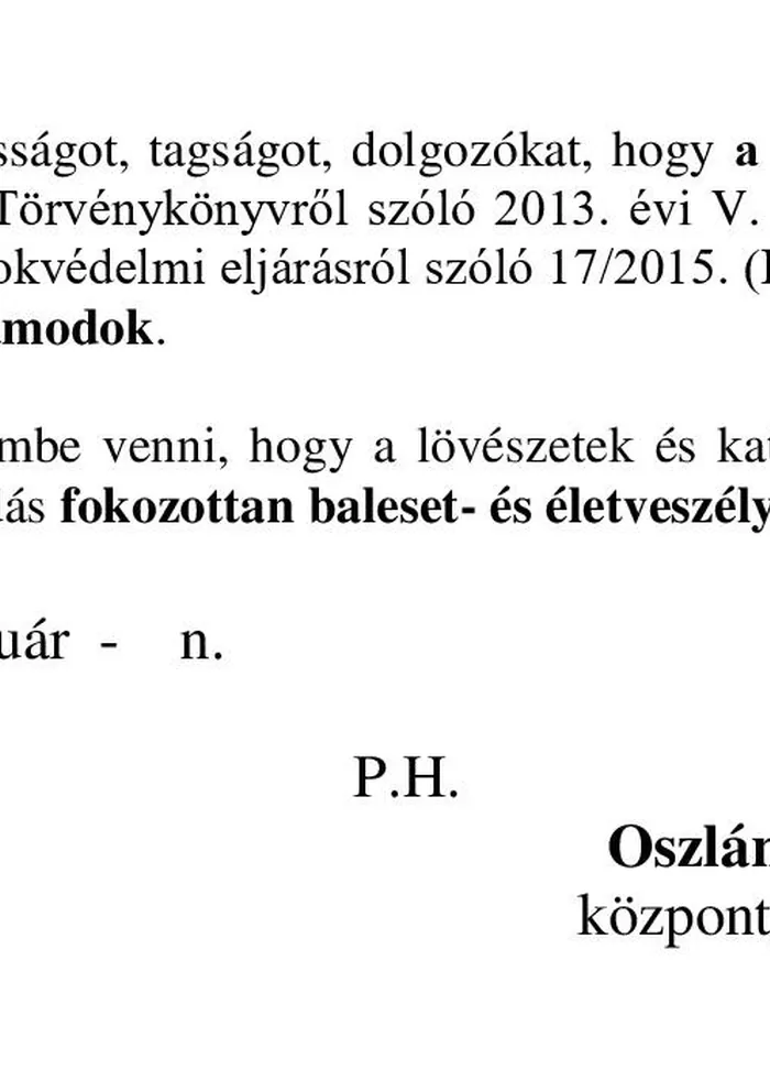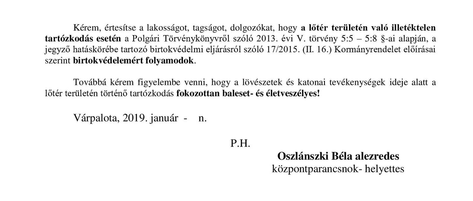 Lőtérértesítő Közszolgálati hír a MH Böszörményi Géza Csapatgyakorlótér Parancsnokság kezelésében lévő honvédségi területeken.
