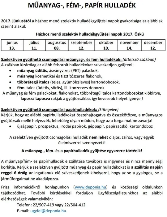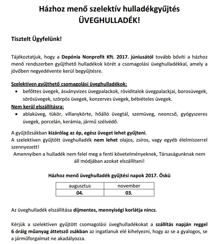 Tájékoztatjuk Önöket, hogy a Depónia Nonprofit Kft. 2017. júniusától tovább bővíti a házhoz menő gyűjthető hulladékok körét a csomagolási üveghulladékkal, amely a jövőben negyedévente kerül begyűjtésre. Alul letölthetik a gyűjtési időpontokat tartalmazó tájékoztatót, amelyet nyomtatható verzióban is megtalálnak, illetve az új hulladéknaptárt is.