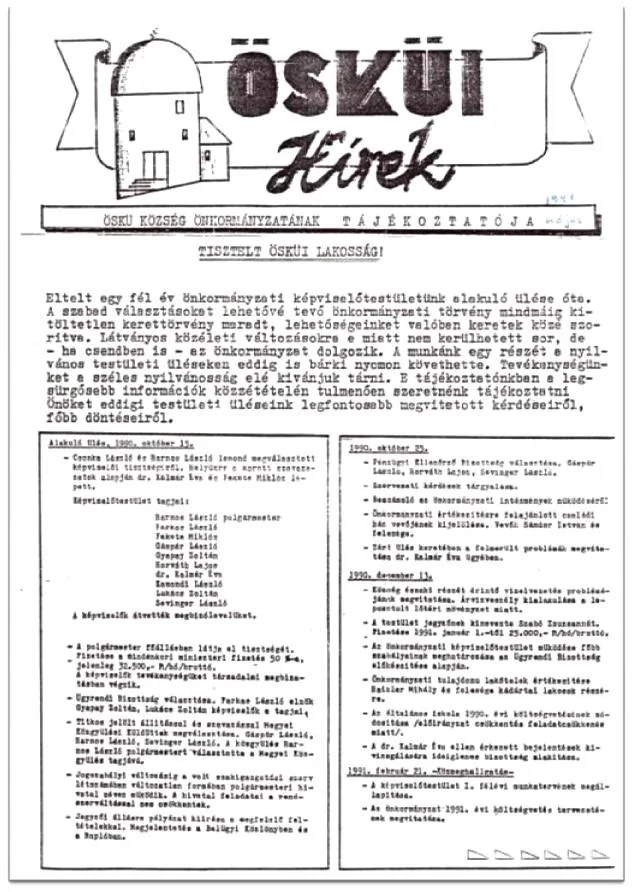 Az önkormányzatok más-más utat választottak a nyilvánosság biztosítására is (akkoriban az internetet még hírből sem lehetett ismerni...). Öskün az 1991. április 25-i ülésen került napirendre ez a kérdés. Gáspár László † és Gyapay Zoltán önkormányzati képviselők meghívták az ülésre a Csákvári Hírmondó felelős szerkesztőjét, Mári Lászlót (iskolánk egykori tanárát), aki ismertette a lapkiadás/szerkesztés eljárásjogi, gazdasági és közéleti kereteit, ill. személyes tapasztalatait. A feladatok, költségek ismeretében, a képviselő-testület a 27/1991. számú határozatában „a hírlap beindításával kapcsolatos előkészítő munkák elvégzésével Gyapay Zoltán alpolgármestert bízta meg”.