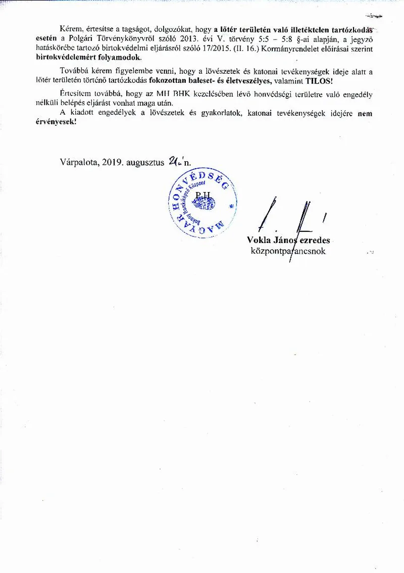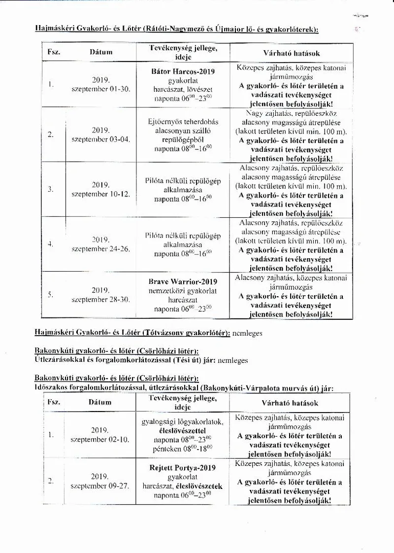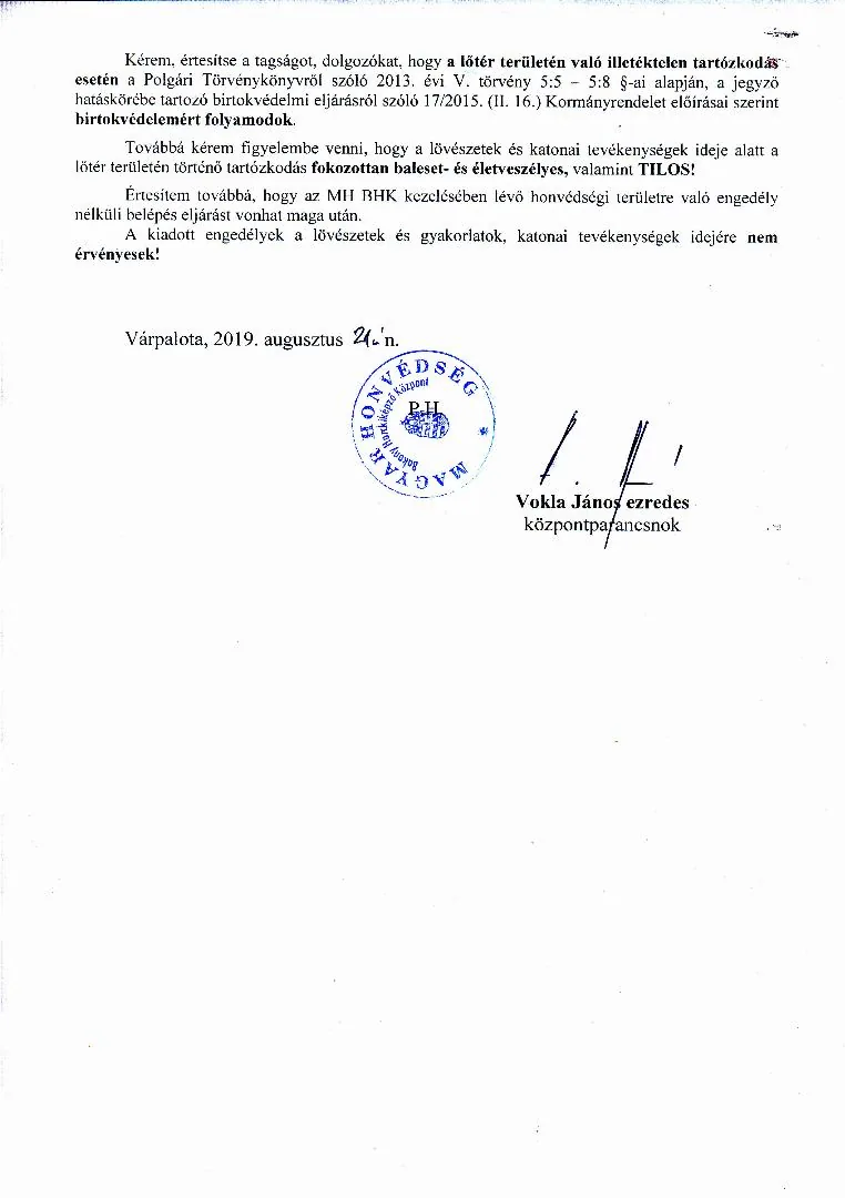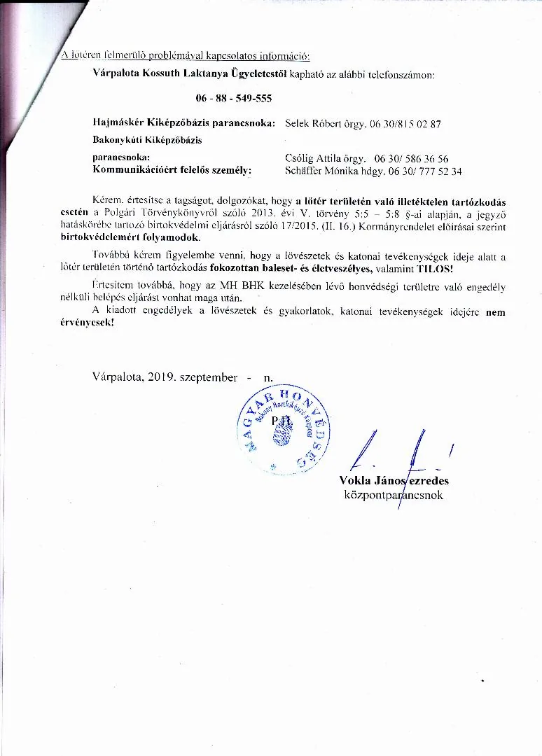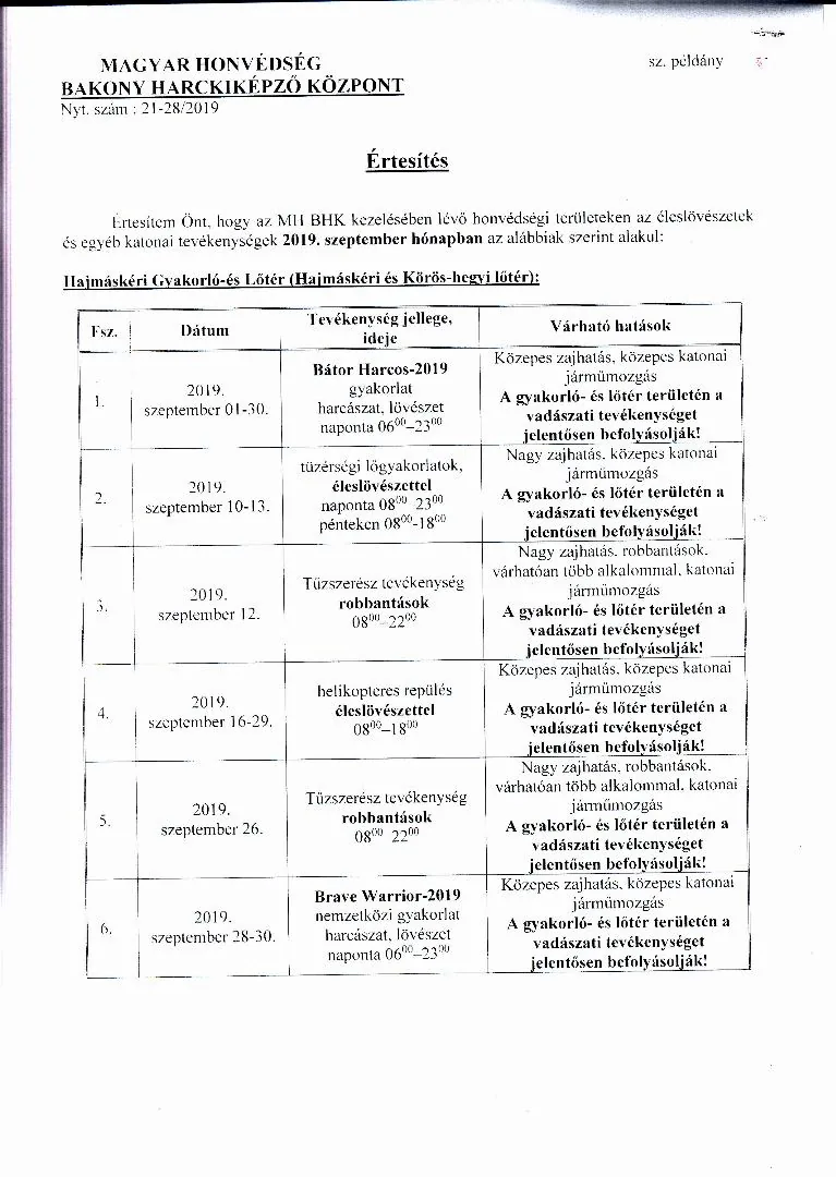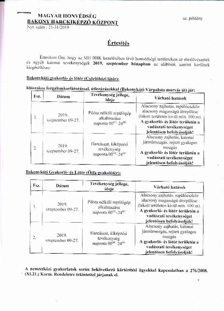 Lőtérértesítő Közszolgálati hír a MH Böszörményi Géza Csapatgyakorlótér Parancsnokság kezelésében lévő honvédségi területeken.