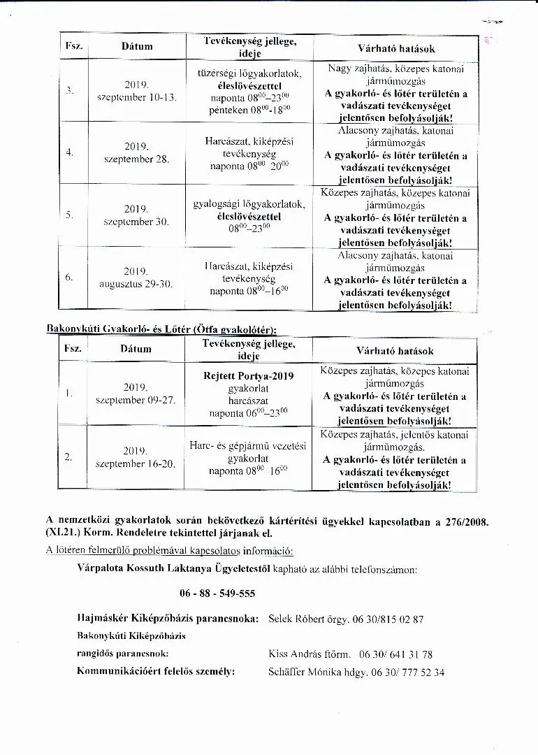BAKONY HARCKIKÉPZŐ KÖZPONT honvédségi területein az éleslövészetek és egyéb katonai tevékenységek alakulása.