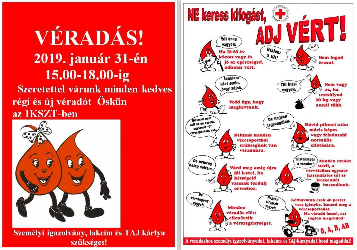 VÉRADÁS!2019. január 31-én15.00-18.00-ig Szeretettel várunk minden kedves régi és új véradótÖskün, az IKSZT-ben Személyi igazolvány, lakcím és TAJ kártya szükséges!