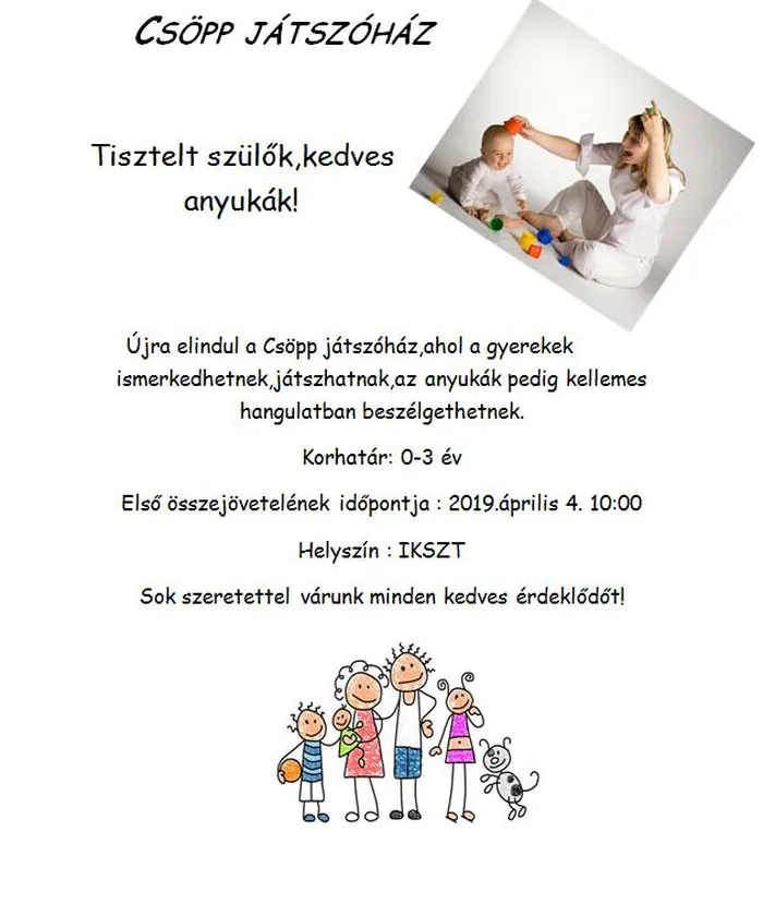 Újra elindul a Csöpp játszóház,ahol a gyerekek ismerkedhetnek,játszhatnak,